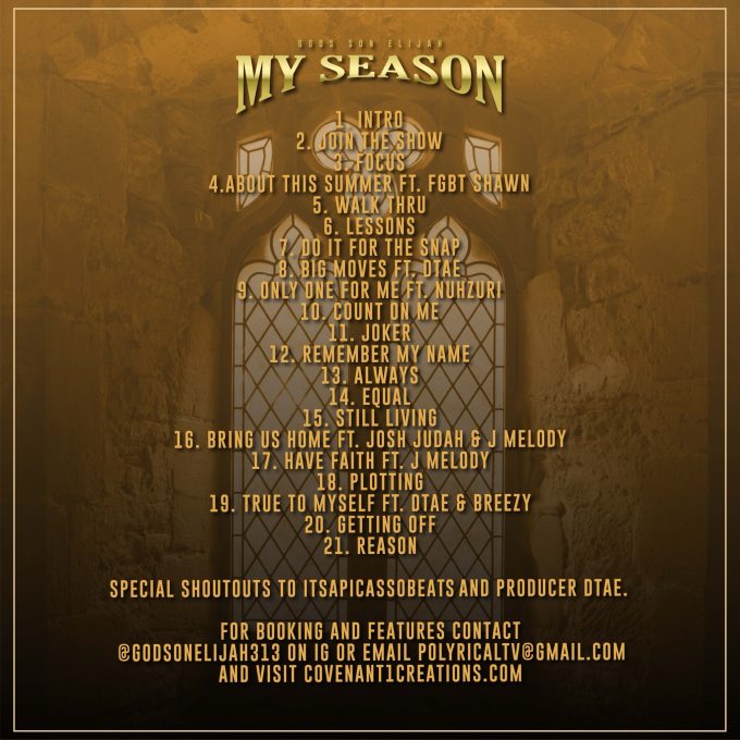 In his third album My Season, Godson Elijah lays out 21 dynamic tracks. Showcasing his versatility he keeps the entire album clean of foul language. The album is headlined by the hit single Do it for the Snap.